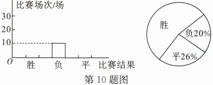 10. 记录某足球队全年比赛结果(“胜”“负”“平”)的条形统计图和扇形统计图(不完整)如图所示.根据图中信息,该足球队全年比赛胜了______场.