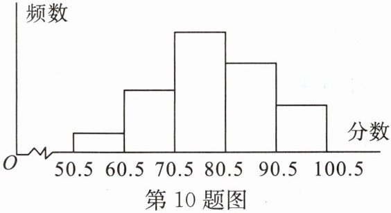 10.某班有48名同学,在一次数学测验中,分别只取整数统计其成绩,绘制出频数分布直方图如图所示,图中从左到右的小长方形的高度比是$1:3:6:4:2$,则分数在70.5到80.5之间的人数是______.