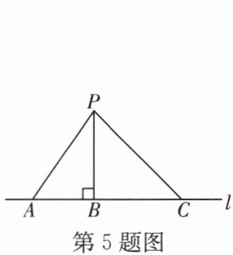 5. (广州中考)如图,点$A$,$B$,$C在直线l$上,$PB\perp l$,$PA = 6\mathrm{cm}$,$PB = 5\mathrm{cm}$,$PC = 7\mathrm{cm}$,则点$P到直线l$的距离是______$\mathrm{cm}$.