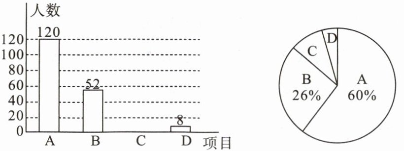 (2)C项目人数为200 - (120 + 52 + 8) = 20(人),补全条形统计图如下: