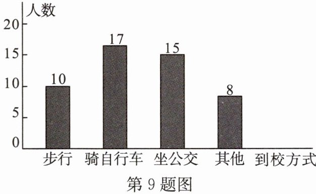 9. 某初中学校共有学生$720$人,该校有关部门从全体学生中随机抽取了$50$人,对其到校方式进行调查,并将调查结果制成了如图所示的条形统计图,由此可以估计全校坐公交到校的学生有______人.