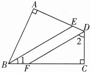 (2)在三角形 FCD 中,$\because ∠C=90^{\circ },\therefore ∠DFC+∠2=90^{\circ }$.又$\because ∠1+∠2=90^{\circ },\therefore ∠1=∠DFC,\therefore BE// DF.$