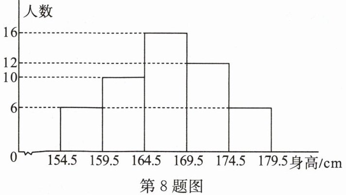 8.为了解某中学300名男生的身高情况,随机抽取若干名男生进行身高测量,将所得数据整理后,画出频数分布直方图(如图).估计该校男生的身高在169.5 cm~174.5 cm之间的人数为______.