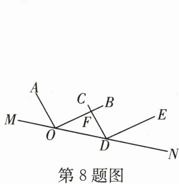 8.如图,点O在直线MN上,$∠AOB$沿直线MN平移到$∠CDE$的位置,此时$OB⊥CD$于点F,若$∠AOM= 50^{\circ }$,则$∠EDN$的度数为______.