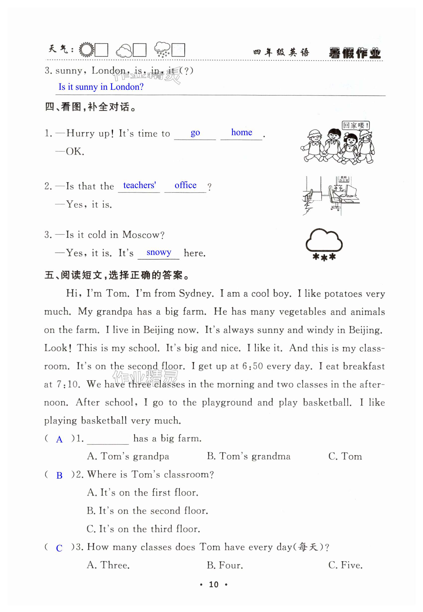 注:目前有些书本章节名称可能整理的还不是很完善,但都是按照顺序排列的,请同学们按照顺序仔细查找。练习册 2025年暑假作业快乐的假日四年级英语 答案主要是用来给同学们做完题方便对答案用的,请勿直接抄袭。