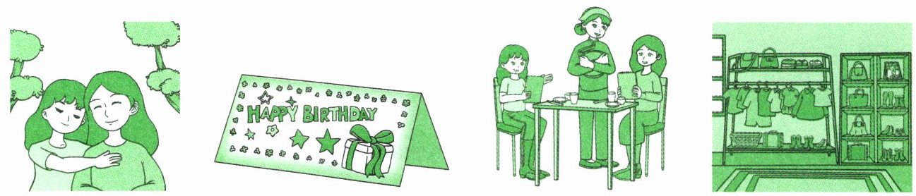 Lily had a wonderful day. In the morning, she hugged her mother warmly. Then she saw a beautiful "Happy Birthday" card. After that, she went to a coffee shop with her friends. They sat at a table, chatting and having drinks. Finally, she visited a clothing store. There were many nice clothes and bags. She really enjoyed her birthday.