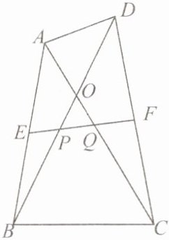【思路点拨】取$BC的中点G$,连接$EG$,$FG$,由中位线的性质可知$EG\equalparallel\frac{1}{2}AC$,$FG\equalparallel\frac{1}{2}BD$,推出$\angle GEF = \angle AQP = \angle GFE = \angle OPQ$即可.