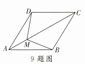 9. 如下图,已知菱形$ABCD$的边长为6,点$M是对角线AC$上的一动点,且$\angle ABC = 120^{\circ}$,则$MA + MB + MD$的最小值是(
