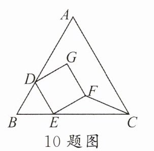 10. 如上图,等边$\triangle ABC与正方形DEFG$重叠,其中$D$,$E两点分别在AB$,$BC$上,且$BD = BE$. 若$AB = 6$,$DE = 2$,则$\triangle EFC$的面积为(