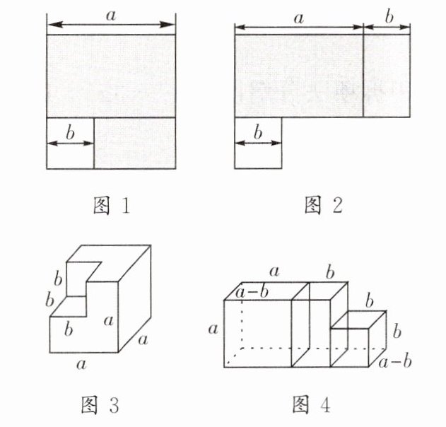 ;【知识迁移】(2) 如图 3, 在边长为 $ a $ 的正方体上挖去一个边长为 $ b $ 的小正方体后, 将余下的部分再切割拼成一个几何体, 如图 4. 根据它们的体积关系可以得到关于 $ a,b $ 的等式为
