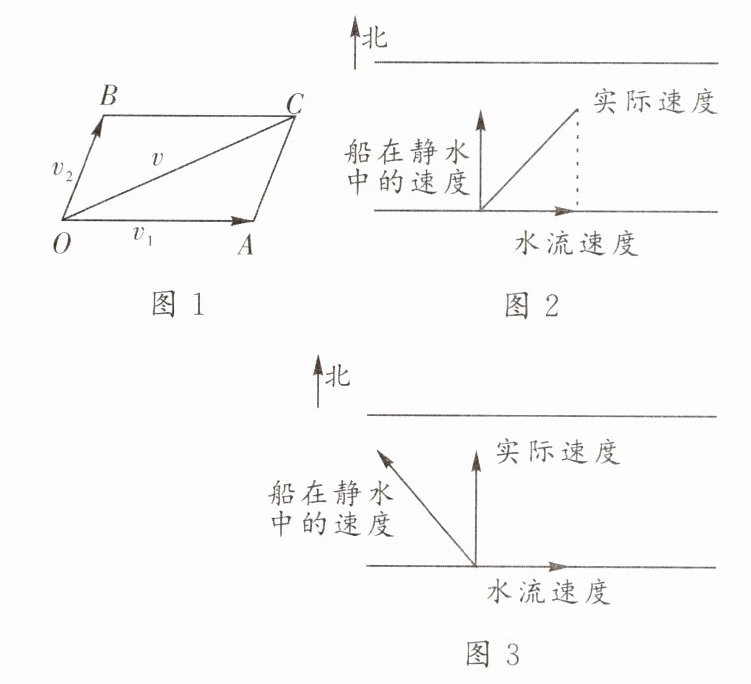 (1)如图2,小船朝着垂直于河岸的方向航行,已知小河的水流速度为3km/h,小船在静水中的航行速度也为3km/h.根据平行四边形法则,小船实际航行的方向为______,实际速度为______km/h;