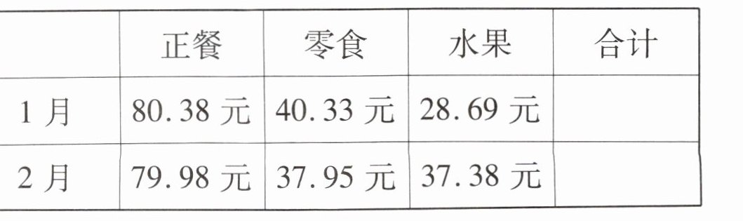 4. 李华每个月的食品花费如下表,把表格补充完整。