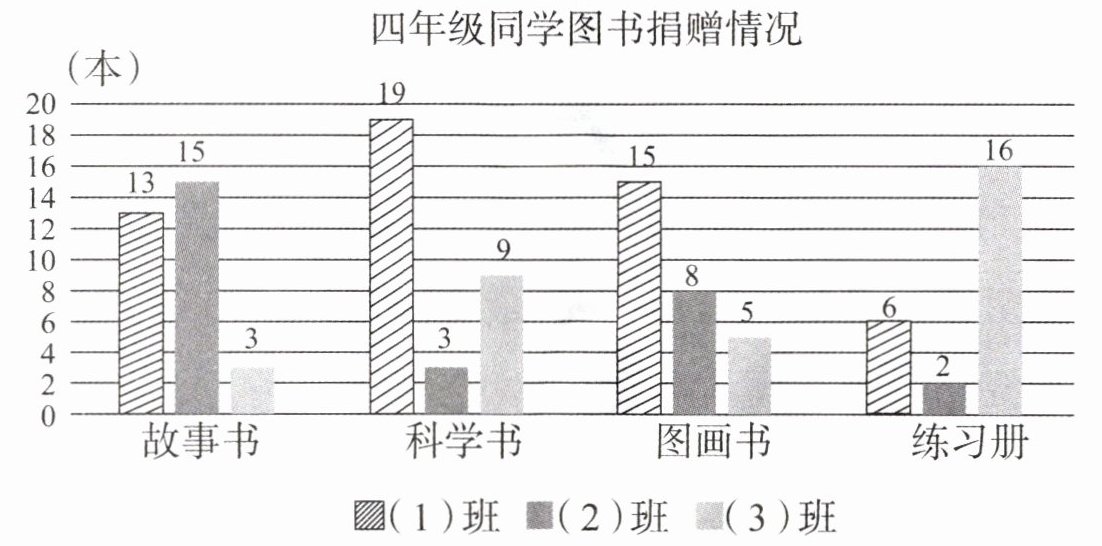 (1) 从图中可以看出,( )班捐赠的故事书最多,( )班捐赠的科学书最多,( )班捐赠的图画书最少,( )班捐赠的练习册最多。