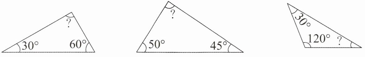 因为直角三角形最多有一个直角,所以另外两个角的度数是 $ ( 180 ^ { \circ } - 90 ^ { \circ } ) \div 2 = 45 ^ { \circ } $