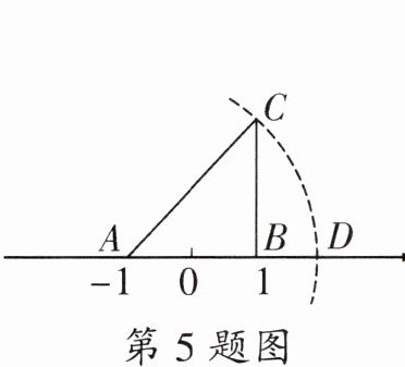 5. 如图,数轴上的点A表示的数是-1,点B表示的数是1,$CB⊥AB$于点B,且$BC= 2$,以点A为圆心,AC为半径画弧交数轴于点D,则点D表示的数为( )