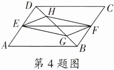 4. 如图,点 $E$,$F$ 分别是 $□ ABCD$ 边 $AD$,$BC$ 的中点,$G$,$H$ 是对角线 $BD$ 上的两点,且 $BG = DH$。则下列结论:① $GF = EH$;②四边形 $EGFH$ 是平行四边形;③ $EG = FH$;④ $EH \perp BD$,其中正确的是______。(填序号)