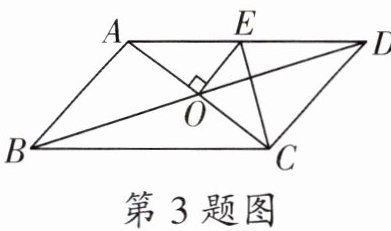 3. 如图,在 $□ ABCD$ 中,对角线 $AC$,$BD$ 相交于点 $O$,过点 $O$ 作 $OE \perp AC$,交 $AD$ 于点 $E$,连接 $CE$,若 $\triangle CDE$ 的周长为 $8$,则 $□ ABCD$ 的周长为______。