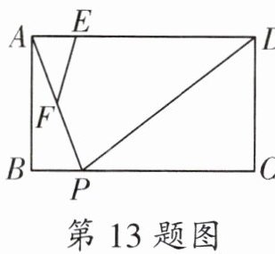 13. 如图,在矩形 $ABCD$ 中,$AB = 3$,$AD = 6$,$E$ 是 $AD$ 上一点,$AE = 1$,$P$ 是 $BC$ 上一动点,连接 $AP$,取 $AP$ 的中点 $F$,连接 $EF$,当线段 $EF$ 取得最小值时,线段 $PD$ 的长度是______。