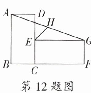 12. 矩形 $ABCD$ 与矩形 $ECFG$ 如图放置,点 $B$,$C$,$F$ 在同一直线上,点 $C$,$E$,$D$ 在同一直线上,连接 $AG$,取 $AG$ 的中点 $H$,连接 $EH$。若 $AB = CF = 4$,$BC = CE = 2$,则 $EH = $______。