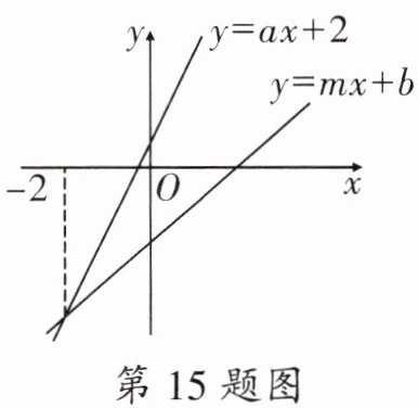 15. 如图,已知直线$y = ax + 2与直线y = mx + b的交点的横坐标是-2$.根据图象有下列四个结论:①$a > 0$;②$b < 0$;③方程$ax + 2 = mx + b的解是x = - 2$;④不等式$ax - b > mx - 2的解集是x > - 2$.其中正确的是______.(填序号)