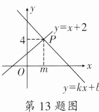 13. 如图,一次函数$y = kx + b与y = x + 2的图象相交于点P(m,4)$,则关于$x的方程kx + b = 4$的解是______.