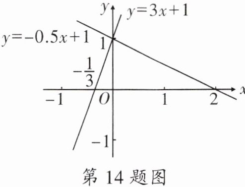 14. 观察如图所示图象,可以得出不等式组$\begin{cases}3x + 1 > 0,\\0.5x - 1 < 0\end{cases} $的解集是______.