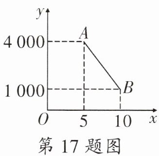 17. 某苹果种植合作社通过网络销售苹果,如图中线段$AB为苹果日销售量y$(千克)与苹果售价$x$(元/千克)的函数图象的一部分.已知 1 千克苹果的成本价为 5 元,如果某天以 8 元/千克的价格销售苹果,那么这天销售苹果的盈利是______元.