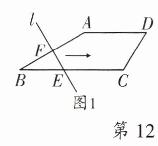 12. 如图1,在四边形$ABCD$中,$AD // BC$,$\angle B = 30^{\circ}$,直线$l \perp AB$.当直线$l沿射线BC$方向,从点$B$开始向右平移时,直线$l与四边形ABCD的边分别相交于点E$,$F$.设直线$l向右平移的距离为x$,线段$EF的长为y$,且$y与x$的函数关系如图2所示,则四边形$ABCD$的周长是______.