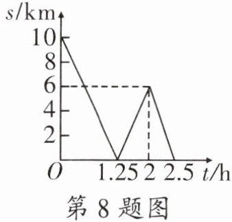 8. 一条公路旁依次有$A$,$B$,$C$三个村庄,甲乙两人骑自行车分别从$A$村,$B村同时出发前往C$村,甲乙之间的距离$s(km)与骑行时间t(h)$之间的函数关系如图所示,下列结论:①$A$,$B两村相距10 km$;②出发$1.25 h$后两人相遇;③甲每小时比乙多骑$8 km$;④相遇后,乙又骑行了$15 min或65 min时两人相距2 km$.其中正确的有 ( )