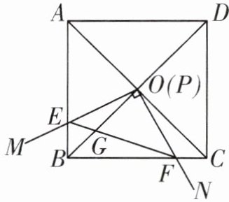 4. 如图,边长为1的正方形ABCD的对角线AC,BD相交于点O,∠MPN为直角,使点P与点O重合,直角边PM,PN分别与OA,OB重合,然后绕点O逆时针旋转∠MPN,旋转角为θ($ 0 ^ { \circ } < \theta < 90 ^ { \circ } $),PM,PN分别交AB,BC于E,F两点,连接EF交OB于点G,则下列结论:①$ E F = \sqrt { 2 } O E $;②$ S _ { \text { 四边形 } O E B F } : S _ { \text { 正方形 } A B C D } = 1 : 4 $;③$ B E + B F = \sqrt { 2 } O A $;④在旋转过程中,EF的最小值为$ \frac { \sqrt { 2 } } { 2 } $.其中结论正确的有 ( )