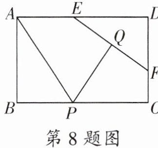 8. 如图,矩形 $ABCD$ 中,$AB = 2$,$AD = 3$. $E$,$F$ 分别是 $AD$,$CD$ 上的动点,$EF = 2$. $Q$ 是 $EF$ 的中点,$P$ 为 $BC$ 上的动点,连接 $AP$,$PQ$. 则 $AP + PQ$ 的最小值等于______.