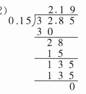 $\begin{array}{r} 2.19\\ 0.15\enclose{longdiv} {32.85}\\ 30\\ \hline 28\\ 15\\ \hline 135\\ 135\\ \hline 0\end{array} $