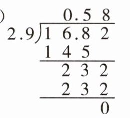 $\begin{array}{r} 0.58\\ 2.9\enclose{longdiv} {16.82}\\ 145\\ \hline 232\\ 232\\ \hline 0\end{array} $