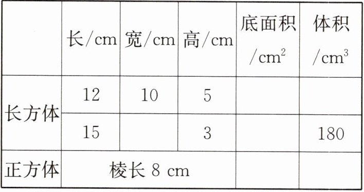 | |长/cm|宽/cm|高/cm|底面积$/cm^{2}$|体积$/cm^{3}$|