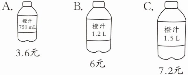 4. 小明去超市买橙汁,有下面三种规格的橙汁可供选择,其中( )包装的橙汁最贵。