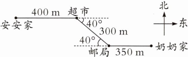 (1)向东走 400 m到达超市,往超市东偏南 40°方向走 300 m到达邮局,再向东走 350 m到达奶奶家。