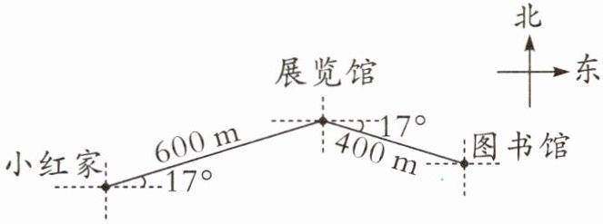 A.小红从家出发,向北偏东$17^{\circ }$方向走 600 m 到达展览馆