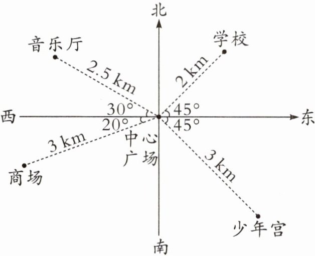 (2)音乐厅在中心广场的( )偏( )( )°的方向上,距离中心广场( )km。