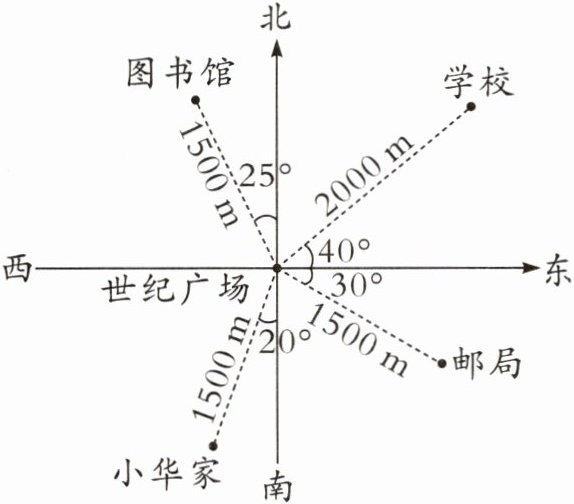 (2)图书馆在世纪广场的( )偏( )( )的方向上,距离是( )m。