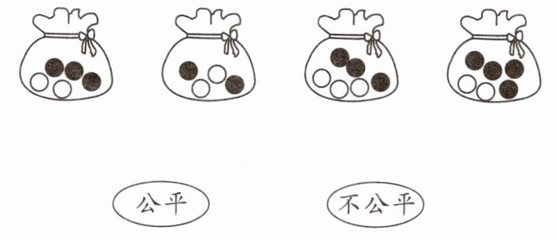 1. 小丽和小华做摸球游戏,每次在口袋里任意摸出一个球,摸到黑球小丽赢,摸到白球小华赢。用下面哪些口袋做摸球游戏是公平的?哪些是不公平的?连一连。(12分)