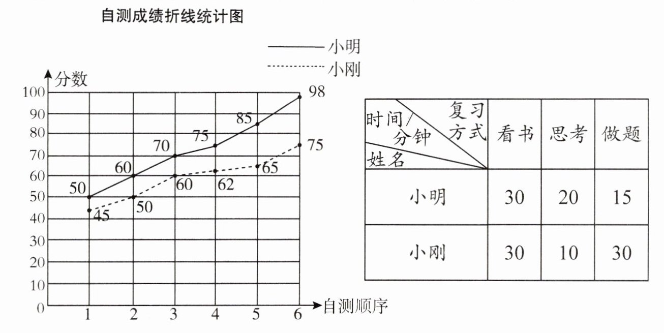 1.下面的统计图和统计表反映了小明和小刚两位同学在小学毕业复习阶段数学自测成绩和每天在家学习的时间分布情况。