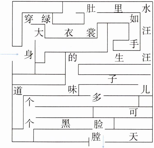 六迷宫中藏着帆帆爱吃的一种水果,只要走完迷宫,并以途中所经过的字当谜面,就知道帆帆爱吃什么水果了。画出路线,并将谜面、谜底写下来。