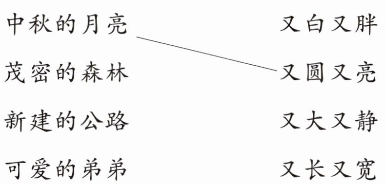 【答案】:中秋的月亮——又圆又亮;茂密的森林——又大又静;新建的公路——又长又宽;可爱的弟弟——又白又胖