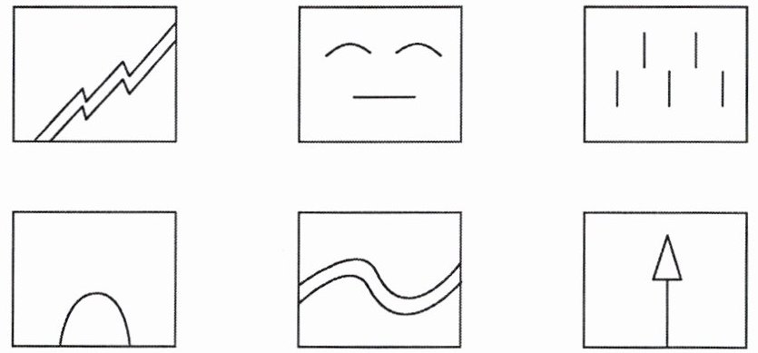 第一个图形像闪电、锯齿;第二个图形像眯着的眼睛和嘴巴,像笑脸;第三个图形像雨滴;第四个图形像拱桥;第五个图形像波浪;第六个图形像小旗子。