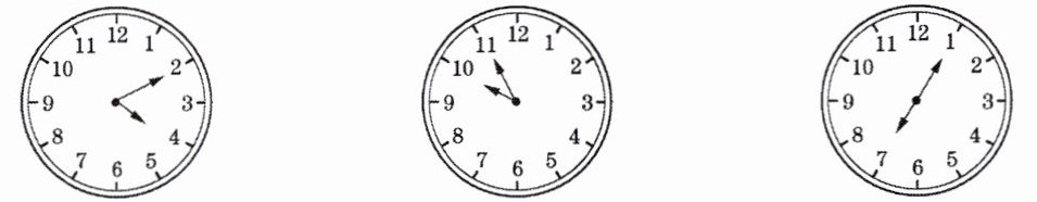 题目给出了三个钟表图,需要识别每个钟表显示的时间。对于二年级的学生来说,本题主要考查对时钟的读法,即时钟上时针和分针的位置与时间的对应关系。需要先看时针的位置确定小时数,再看分针的位置确定分钟数。