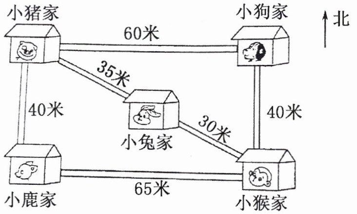 (1)小兔要到小狗家玩,根据图中方向指示,它从家出发向东北方向走到小猴家,再向北走到小狗家。从家到小猴家的距离是$30$米,从小猴家到小狗家的距离是$40$米,所以一共要走$30 + 40 = 70$米。