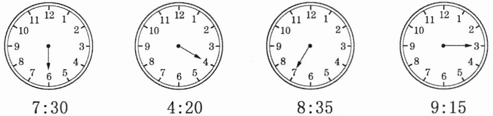 【解析】:本题主要考查对时钟的认识以及时针和分针在钟面上的表示。需要根据给定的时间,在钟面上画出对应的时针位置。需要知道分针走一圈是60分钟,时针走一圈是12小时,因此分针每走一大格代表5分钟,时针每走一大格代表1小时。接下来,逐一分析每个时间点,并确定时针的位置。