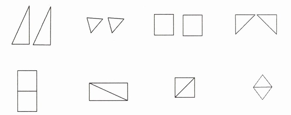 【解析】:通过观察图形的形状、特征等,将每组图形与对应的拼图进行匹配。第一组两个三角形与第四行第二个拼图(由两个三角形组成)相连;第二组两个小三角形与第四行第四个拼图(由两个小三角形组成)相连;第三组两个正方形与第四行第一个拼图(由两个正方形组成)相连;第四组两个直角三角形与第四行第三个拼图(由两个直角三角形组成)相连。