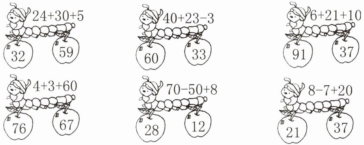 四、毛毛虫吃的是哪个苹果?请圈出来(圈出与算式对应的答案)。
