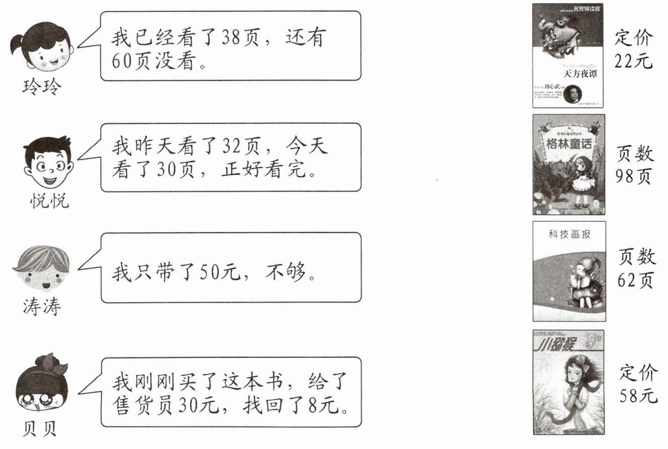 玲玲:已看$38$页,没看$60$页,总页数为$38 + 60 = 98$页,对应《格林童话》(页数$98$页)。